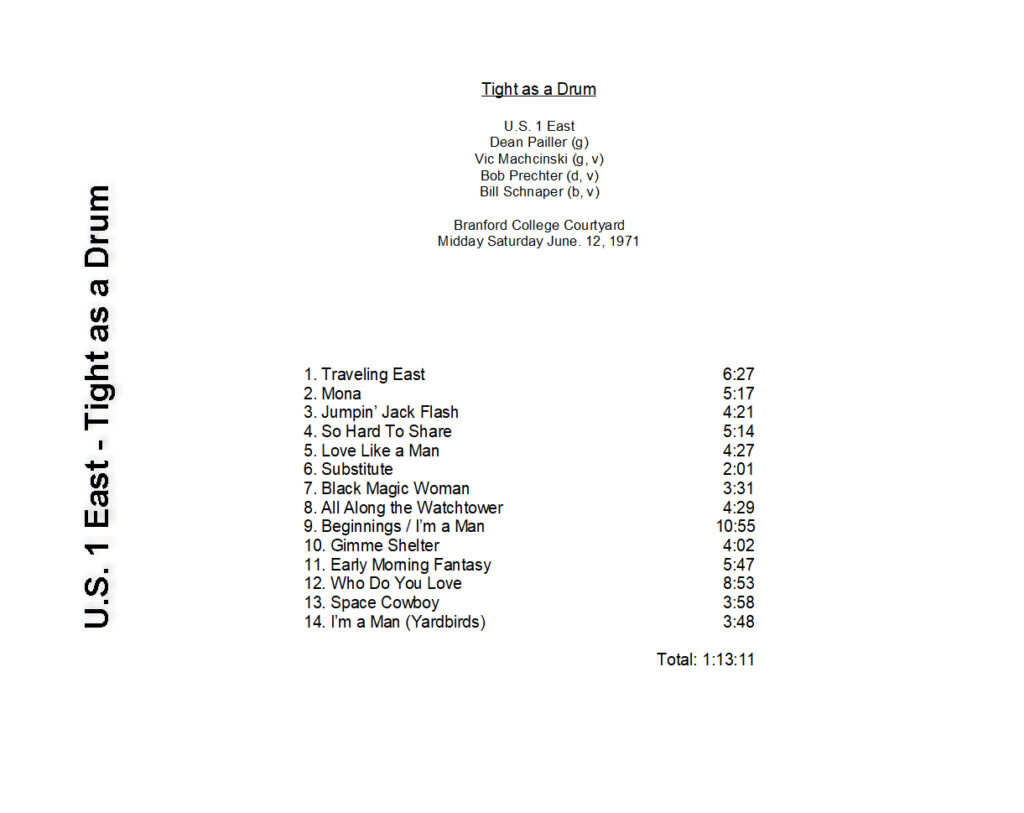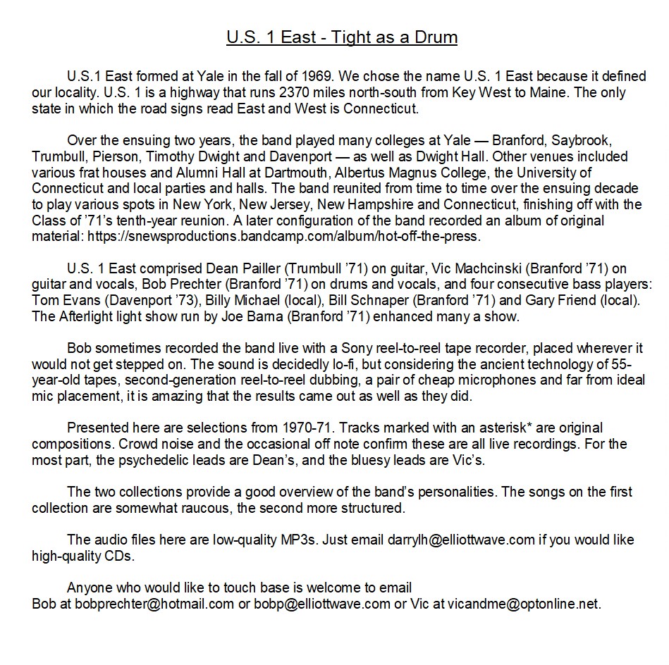U.S. 1 East comprised Dean Pailler (Trumbull ’71) on guitar, Vic Machcinski (Branford ’71) on guitar and vocals, Bob Prechter (Branford ’71) on drums and vocals, and four consecutive bass players: Tom Evans (Davenport ’73), Billy Michael (local), Bill Schnaper (Branford ’71) and Gary Friend (local). The Afterlight light show run by Joe Barna (Branford ’71) enhanced many a show.